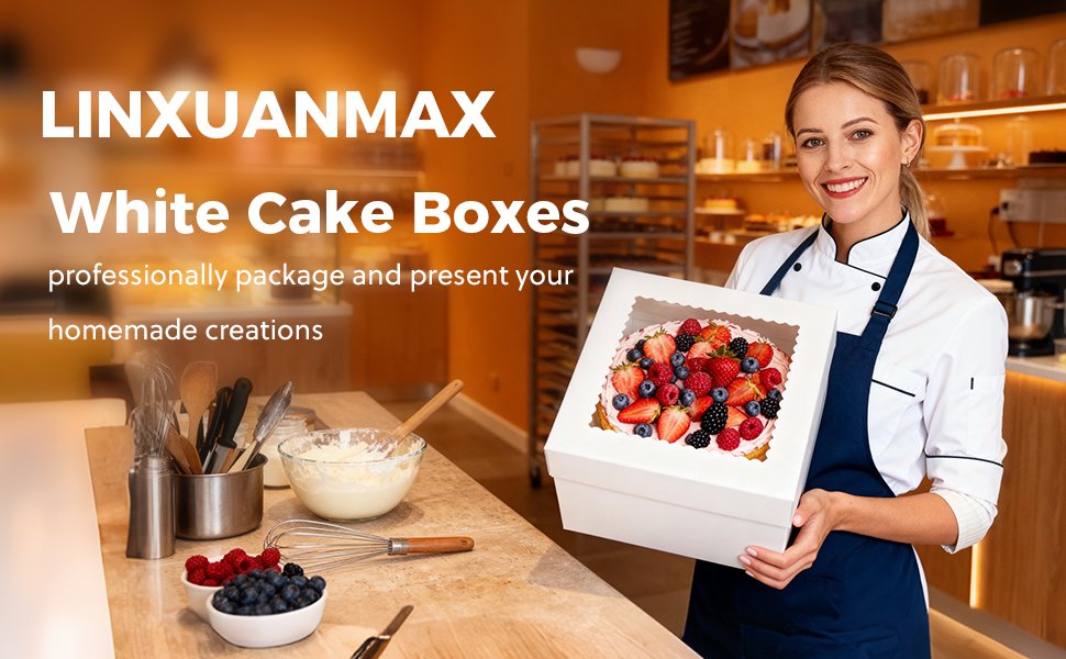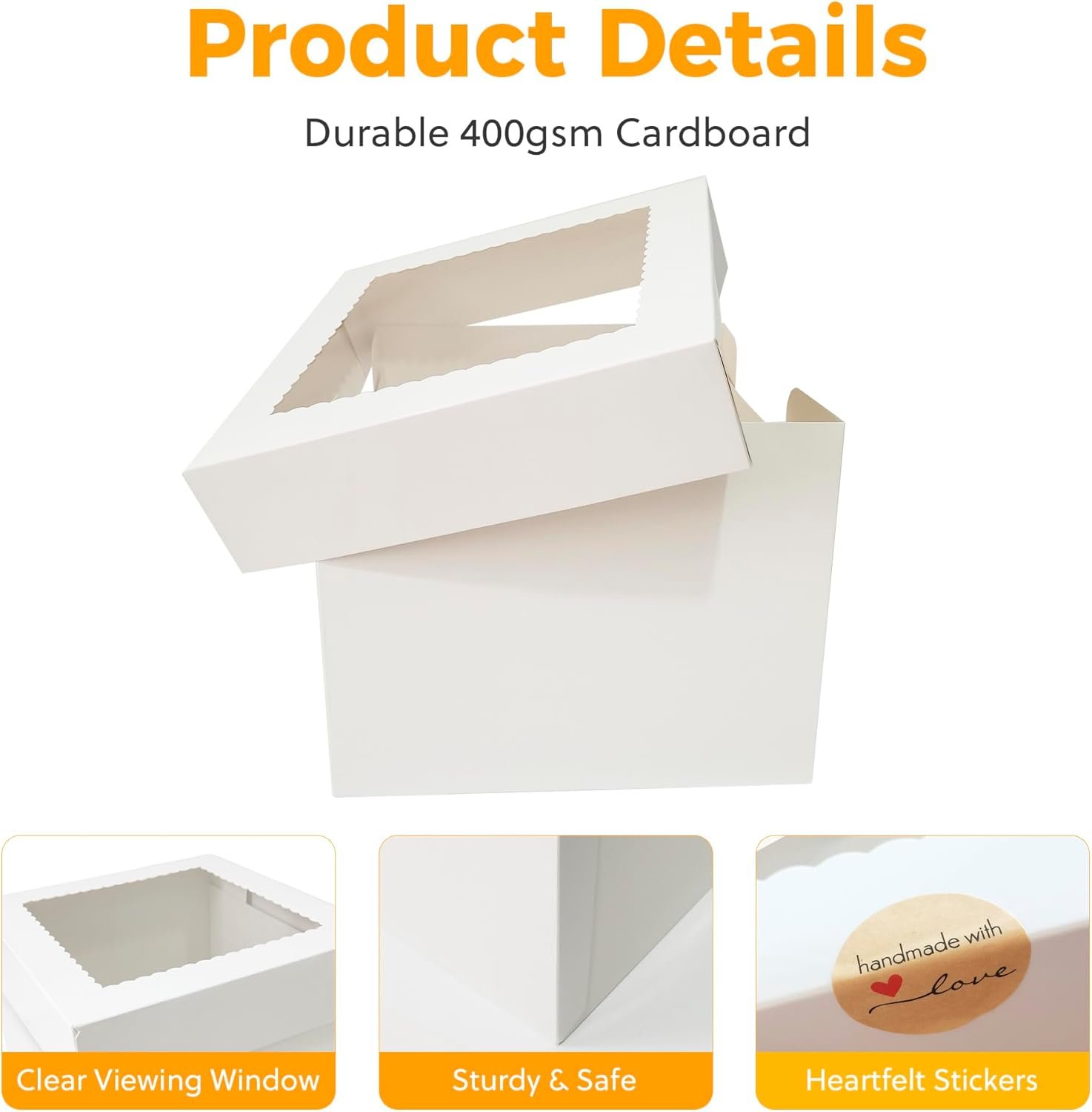 ENSEMBLE COMPLET DE 3 PIECES: Cet ensemble comprend 3 robustes boîtes à gâteau blanches de 25,4 cm (10 pouces), 3 couvercles de boîtes à gâteau, 3 bases assorties de 25,4 cm de diamètre, ainsi que 12 autocollants personnalisables. Parfait pour emballer et présenter vos créations faites maison de manière professionnelle.